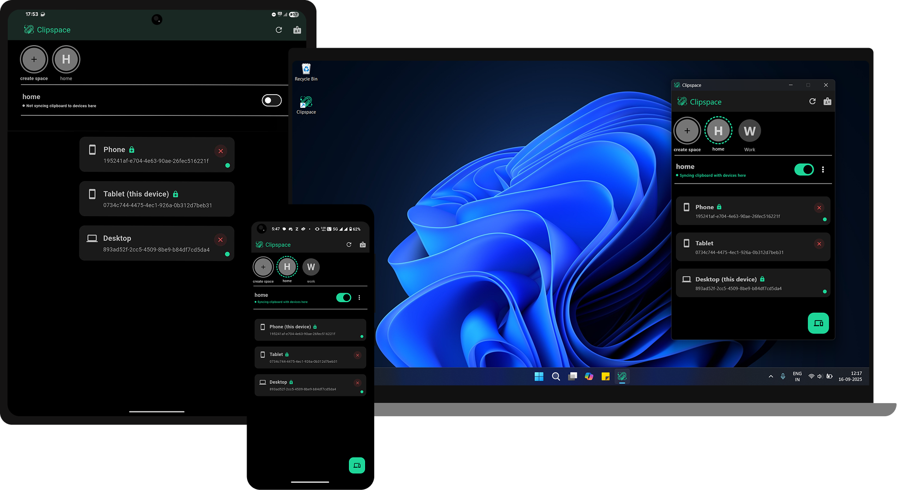 Clipspace seamlessly syncs your clipboard across Android, Linux, and Windows devices. Copy on one device and paste on another — with end-to-end encryption keeping your data secure.
